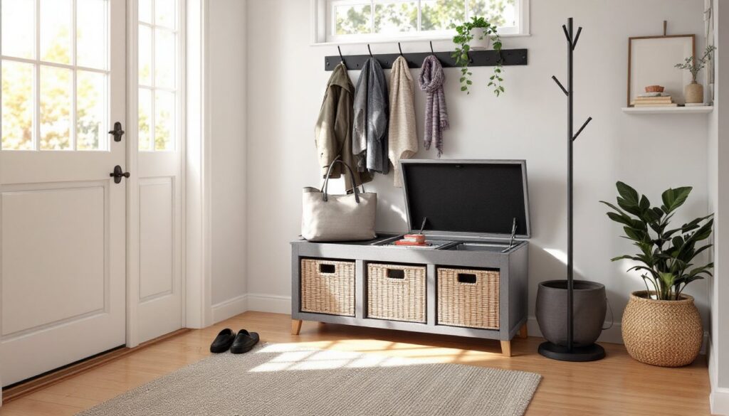 An entryway bench storage solution transforms your front door from a catch-all chaos zone into an organized, functional space. Whether you’re juggling shoes, jackets, bags,
